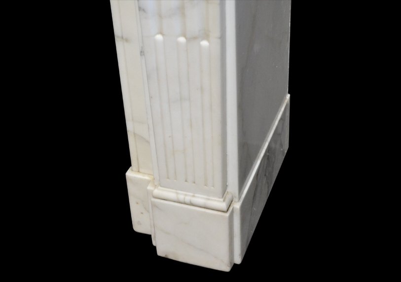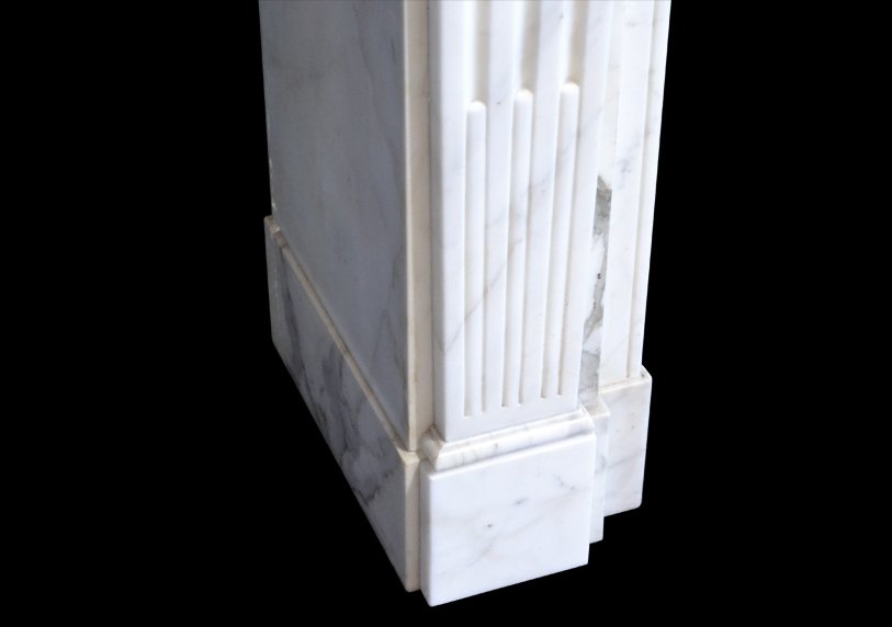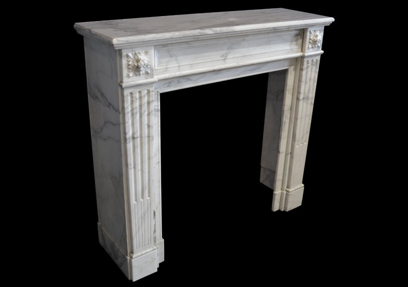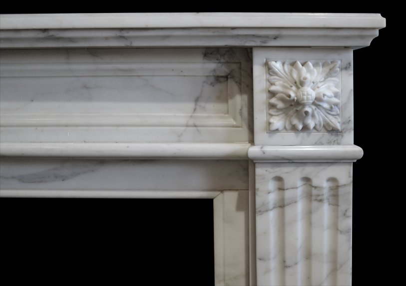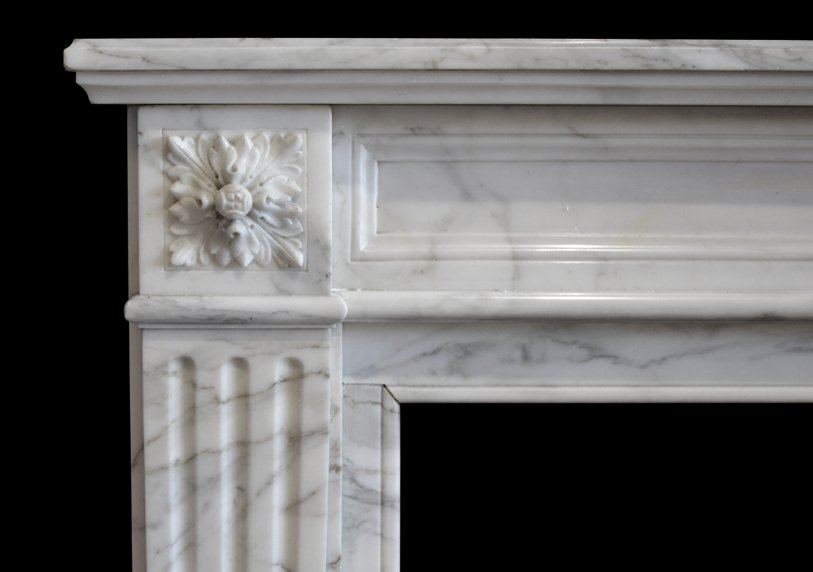 Louis XVI style chimneypiece in Carrara marble with acanthus carved corner blocks and fluted jambs.