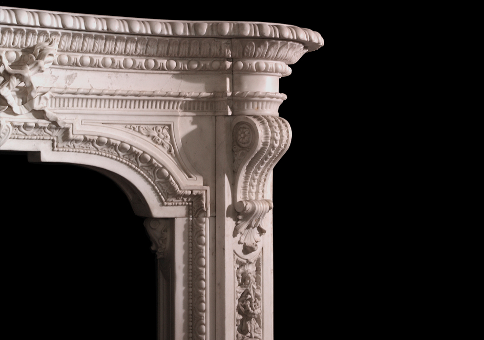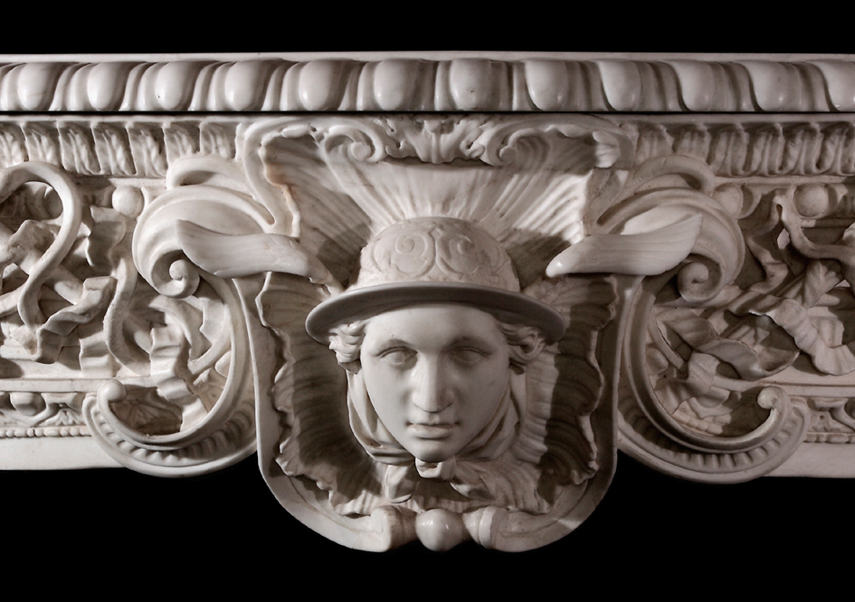 A mid 18th century English carved statuary marble chimneypiece designed by G.B. Borra for the Green Damask room of Norfolk House, St James’s Square. Probably carved by James Lovell circa 1755 with later replacements and repairs.