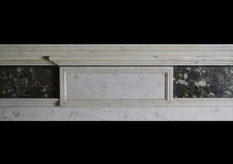 An early 19thc century chimneypiece of architectural form in Carrara marble with end blocks carved with simple rosettes above inverted tapering pilasters in brecciated verde marble and conforming frieze panels, the latter flanking a plain fielded central frieze tablet and terminating with a moulded corniced mantel shelf.
