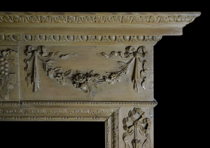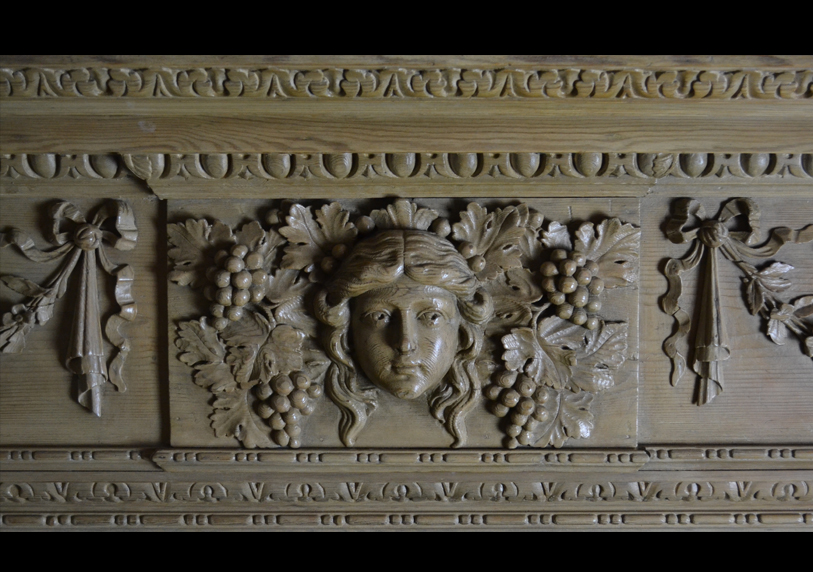 A pine carved Georgian style surround with mask centre plaque, floral swags and floral jambs.