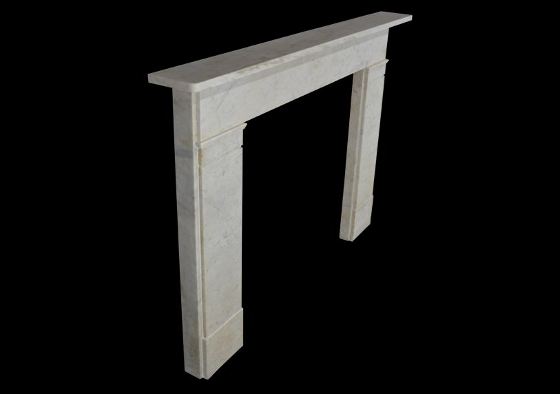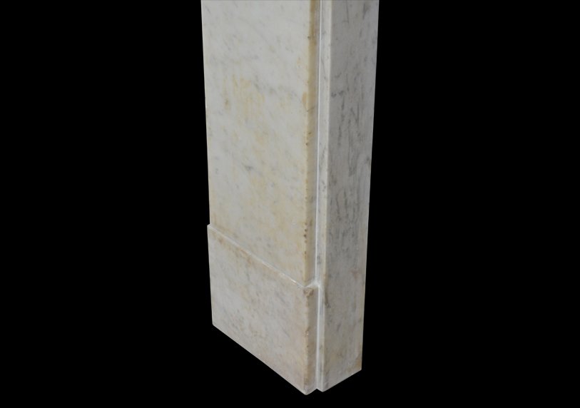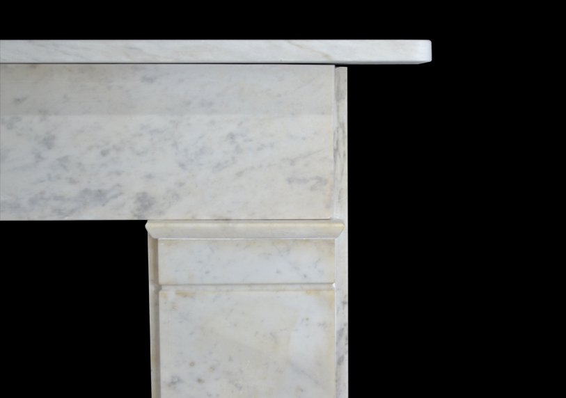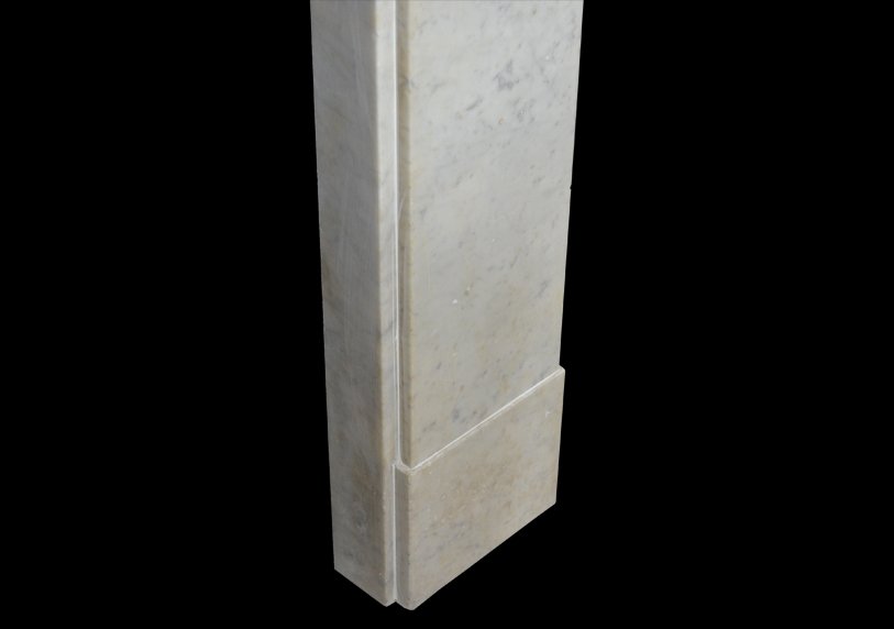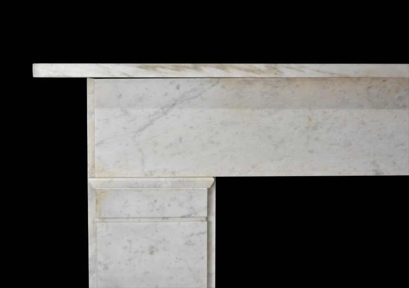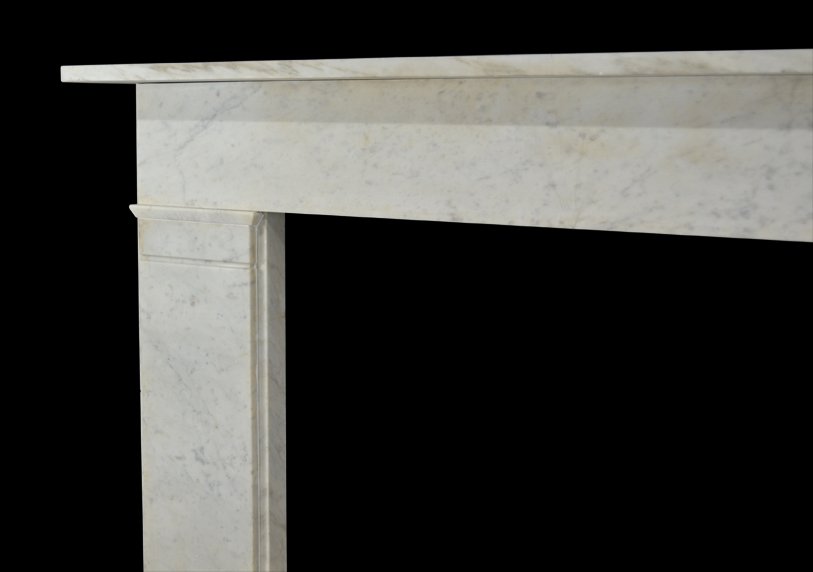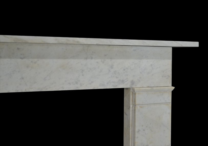 A 19th century chimneypiece of strong architectural from in veined carrara marble with plain pilasters terminating in simple mouldings beneath a continuous frieze.
