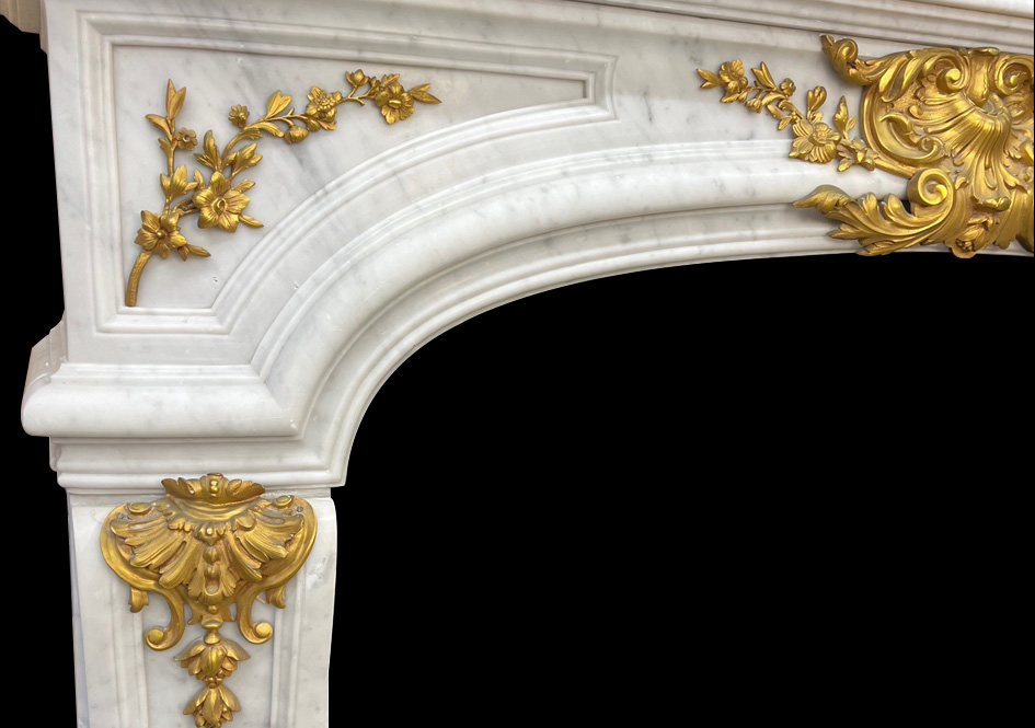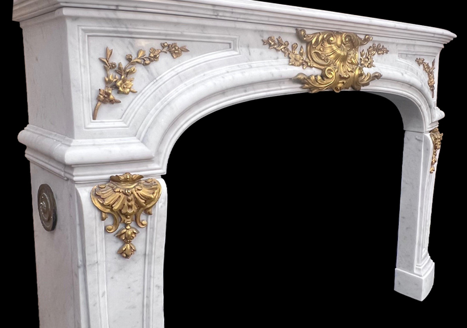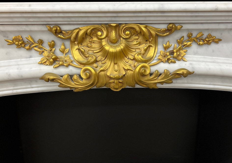 Early 19th c. French Louis-XV-style Carrara marble mantelpiece in excellent condition with bronze ormolu. Cast shell and foliage central cartouche.