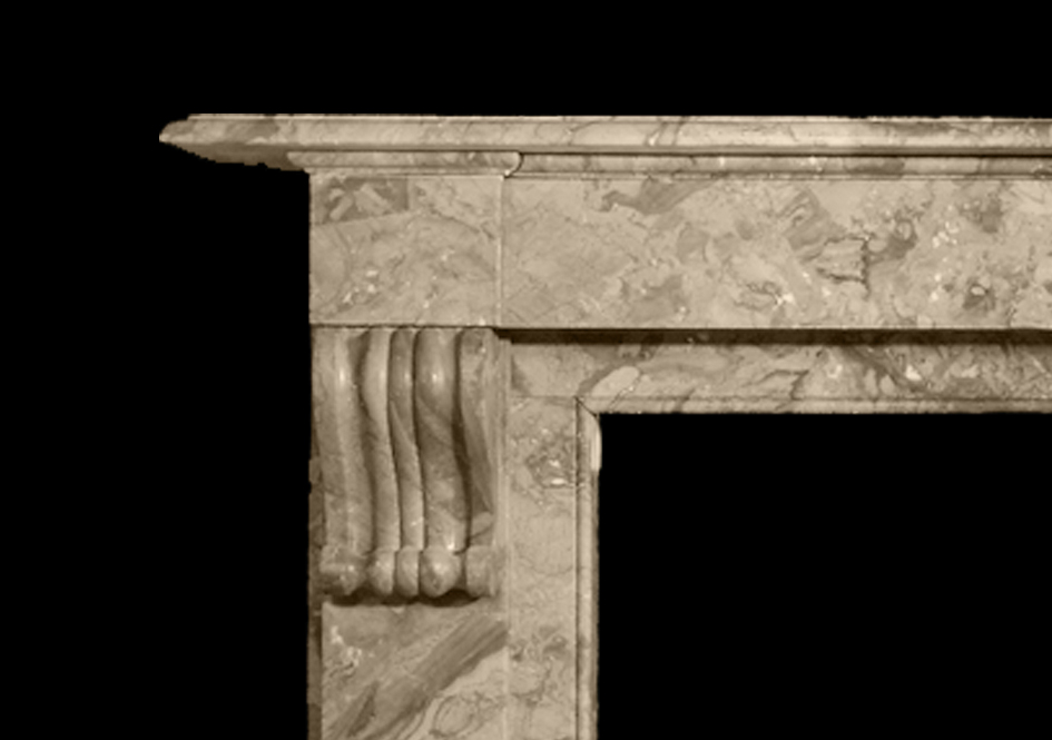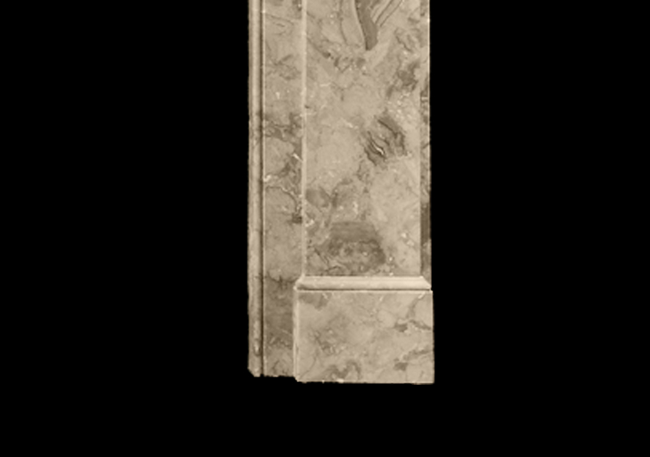 A substantial late 19th century Belgian marble chimneypiece with plain jambs and frieze, the former with a moulded corbel beneath plain corner blocks.