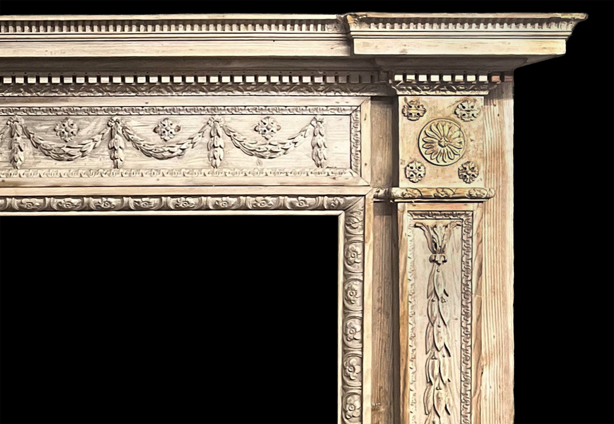A very fine late 18th century neo-classical pine chimneypiece in excellent condition and exquisitely well carved featuring corner blocks carved with rosettes above tapering pilasters carved with pendant bell drops, and running frieze ribbon tied swags beneath a breakfront corniced mantel shelf incorporating tiers of dentil work and fluting c. 1790