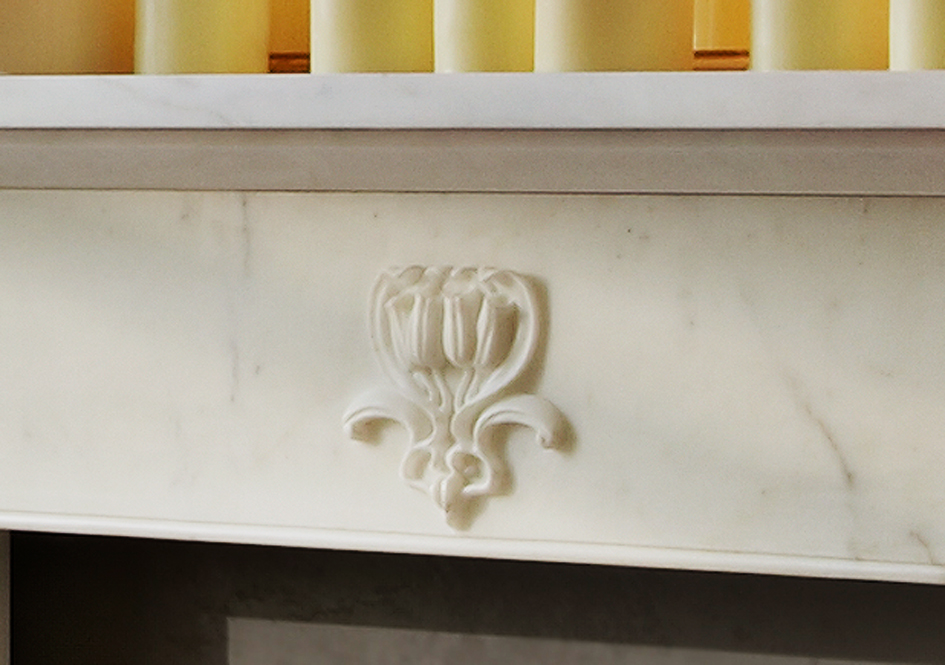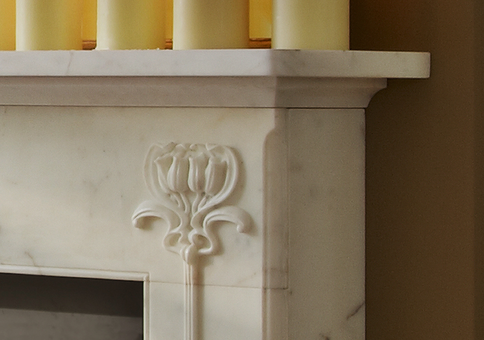 The Hulanicki Art Nouveau surround is carved in Statuary marble to allow the carver to work in the material best suited to capture in crisp detail the sinuous floral carving that characterises this delicate fireplace.