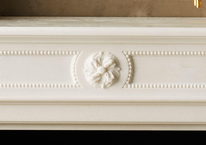 A Louis XVI design in white marble with fielded panels framed by finely carved pearl beading to the frieze and corner blocks, the latter sitting above stop fluted console jambs.