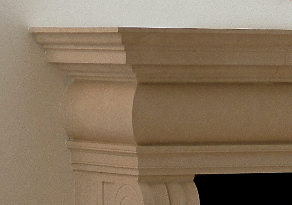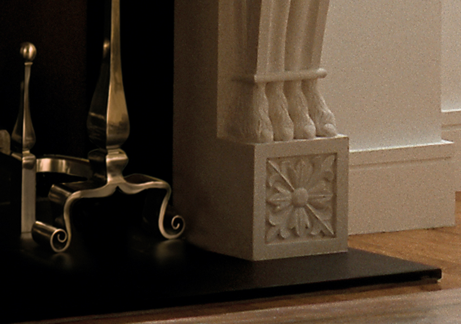 A stone chimneypiece of Italianate design and impressive proportions with elegant console jambs and a generous mantel shelf.