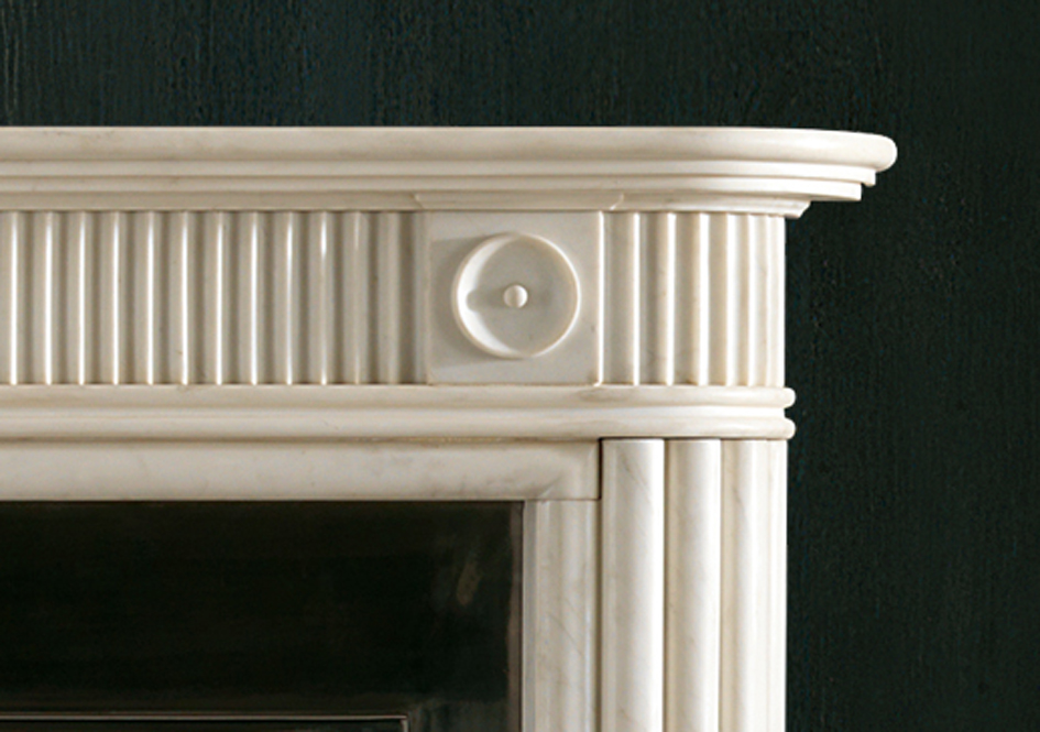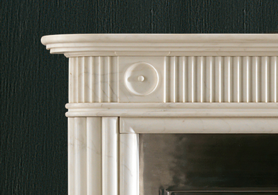 In statuary marble. Commissioned by Robert Fellowes for Shotesham Hall in Norfolk in 1790, this chimneypiece has half round reeded jambs and a ‘running’ frieze of vertical flutes and rosettes.