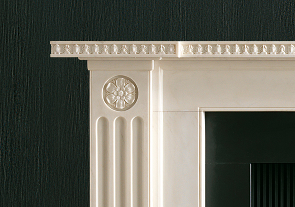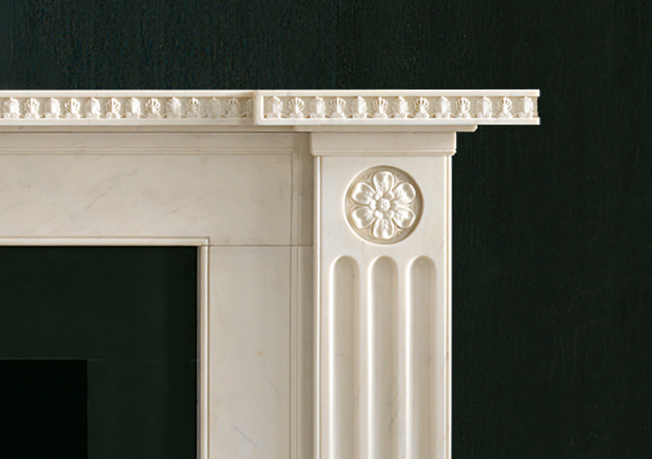 In statuary marble. A design that exemplifies Soane’s unique ability to re-work traditional classic motifs in new and original forms. The chimneypiece has a breakfront shelf carved with anthemion above pilasters headed by finely carved rosettes above deeply incised stop flutes.