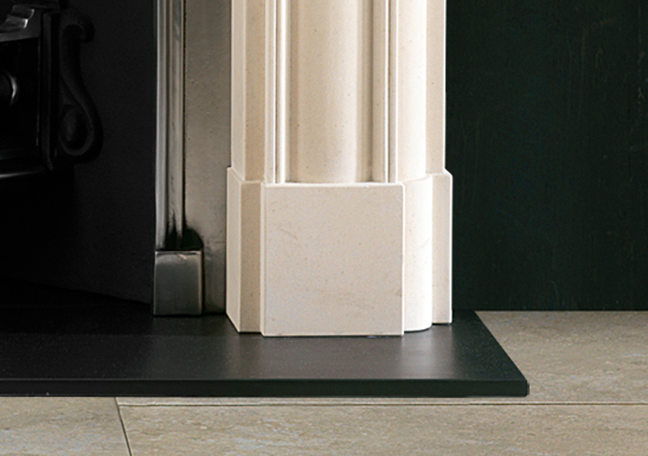 An English stone chimneypiece of early 19th century design, having moulded jambs and frieze with bullseyes to the capitals. Also available in optional sizes.